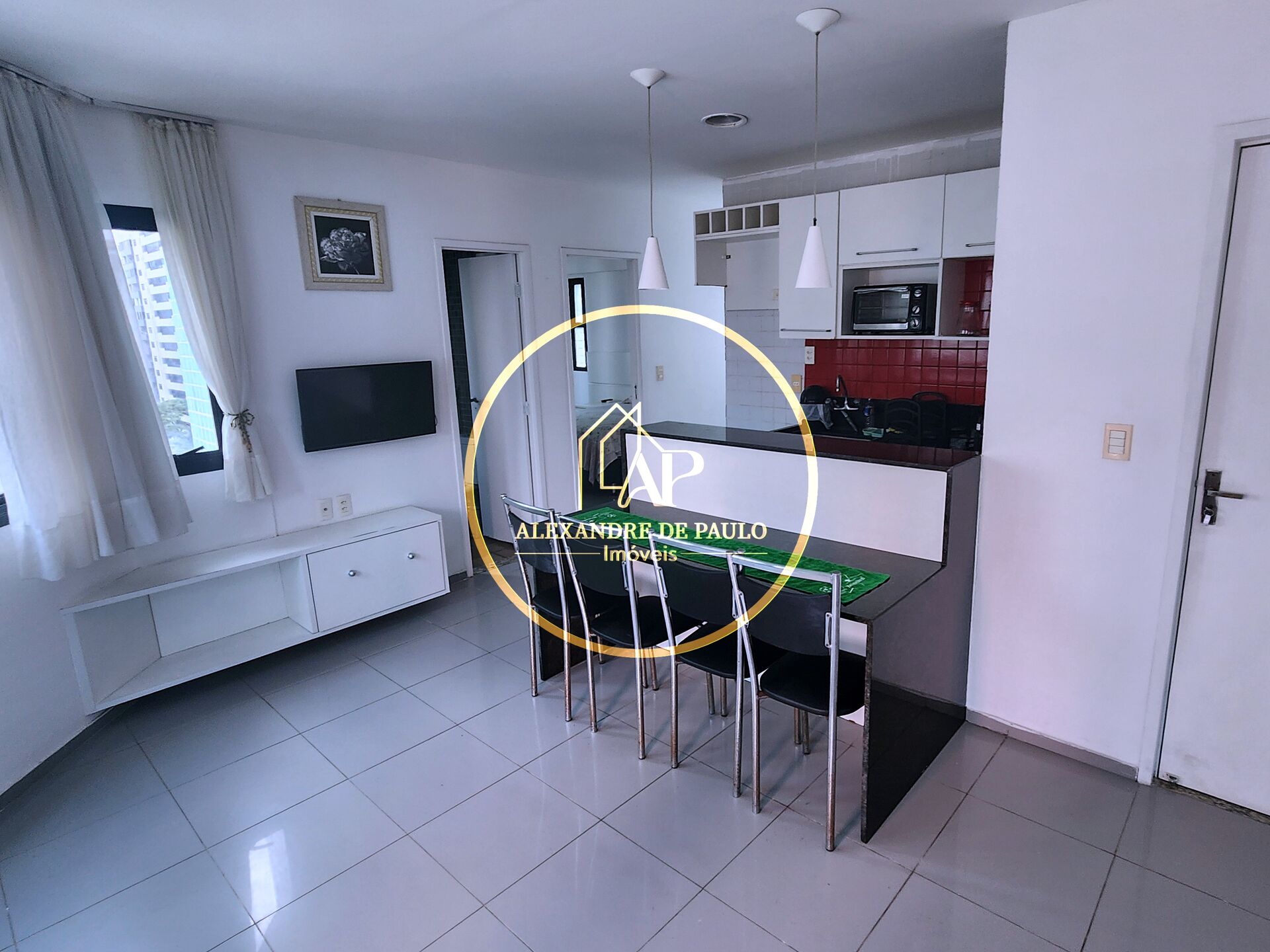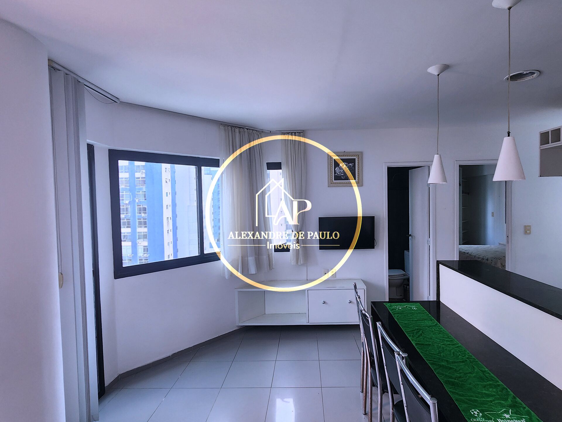 A cozinha também está equipada com armários, fogão e micro-ondas, criando um ambiente prático. Além disso, o apartamento já vem mobiliado, o que significa que você poderá se mudar imediatamente.